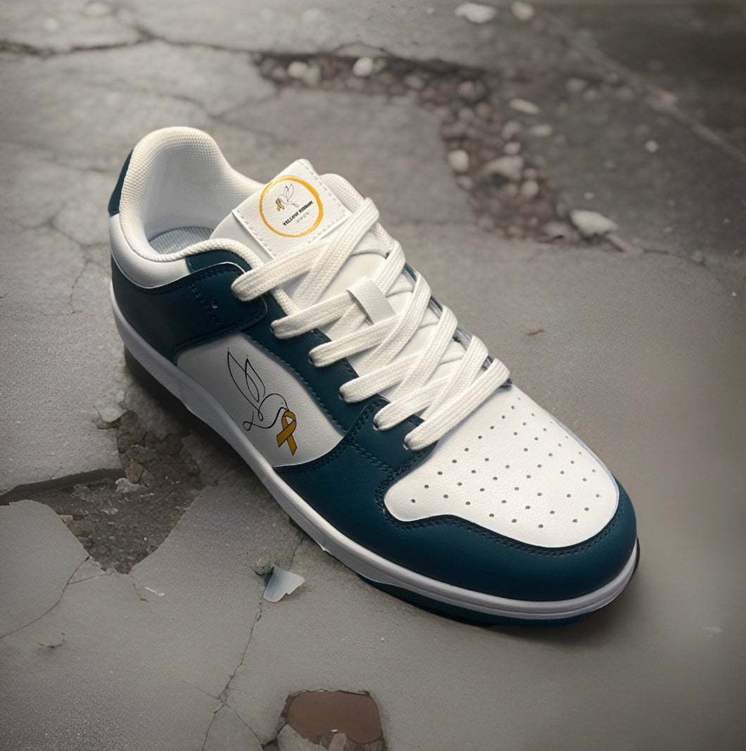 These Yellow Ribbon Shoes combine striking blue leather craftsmanship with a meaningful design featuring our company logo. This shoe not only is for the hostages, but it serves as a reminder of the terrors of October 7th, and symbolizes the hope that we as a people must have. It blends style with a message of hope and solidarity. Perfect for those who want to wear their support with pride and to never forget the terrible massacre that was witnessed on October 7th, 2023